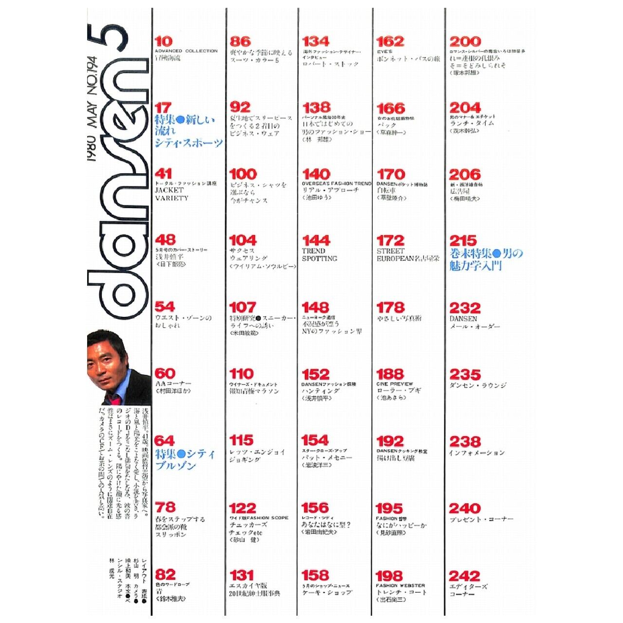 ◆特集 新しい流れ シティ・スポーツ / ADVANCED COLLEECTION 冒険海流 / トータル・ファッション講座 JACKET VARIETY / 5月号のカバー・ストーリー 浅井慎平 / ウエスト・ゾーンのおしゃれ / 特集 シティ ブルゾン / 春をステップする都会派の靴 スリッポン / 色のワードローブ 青 / ビジネス・シャツを選ぶなら今がチャンス / 特別研究 スニーカー・ライフへの誘い / ウイナーズ・ドキュメント 報知青梅マラソン / レッツ・エンジョイ ジョギング / エスカイヤ版 20世紀紳士服事典 / ニューヨーク通信 不況感が漂うNYのファッション界 / DANSEN ファッション探険 ハンティング / スター・クローズ・アップ パット・メセニー / ケーキ・ショップ / STREET EUROPEAN 名古屋 栄 / やさしい写真術 / CINE PREVIEW ローラー・ブギ / FASHION 哲学 なにがハッピーか 見砂直照 / 他 ・・・目次より