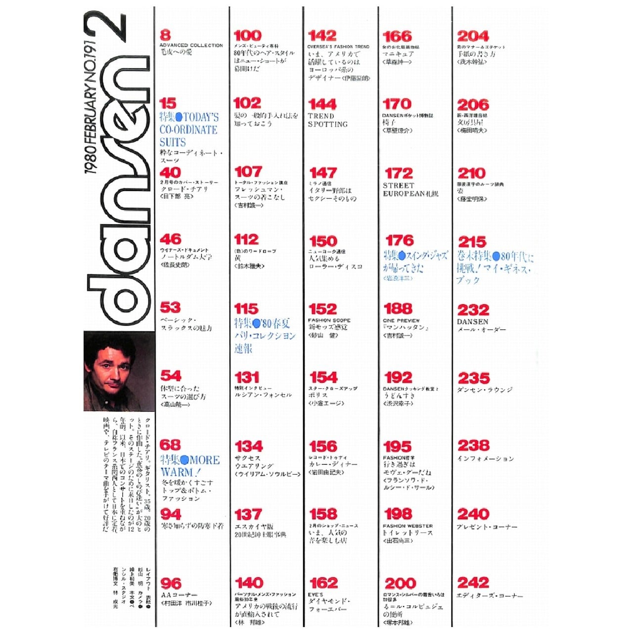 ◆毛皮への愛 / 特集 TODAY'S CO-ORDINATE SUITS 粋なコーディネート・スーツ / 2月号のカバー・ストーリー クロード・チアリ / ウイナーズ・ドキュメント ノートルダム大学 / ベーシック・スラックスの魅力 / 特集 MORE WARM! 冬を暖かくすごす トップ&ボトム・ファッション / 80年代のヘア・スタイルはニュー・ショートが幕開けだ / 色のワードローブ 黄 / 特集 '80春夏パリ・コレクション速報 / 特別インタビュー ルシアン・フォンセル / パーソナル・メンズ・ファッション風俗30年史 アメリカの戦後の流行が直輸入されて / いま、アメリカで活躍しているのはヨーロッパ系のデザイナー / ミラノ通信 イタリア野郎はセクシーそのもの / ニューヨーク通信 ローラー・ディスコ / FASHION SCOP 新モッズ感覚 / 女のお化粧捕物帖 マニキュア / DANSENポケット博物誌 椅子 / 特集 スイング・ジャズが帰ってきた / CINE PREVIEW マンハッタン / 他 ・・・目次より