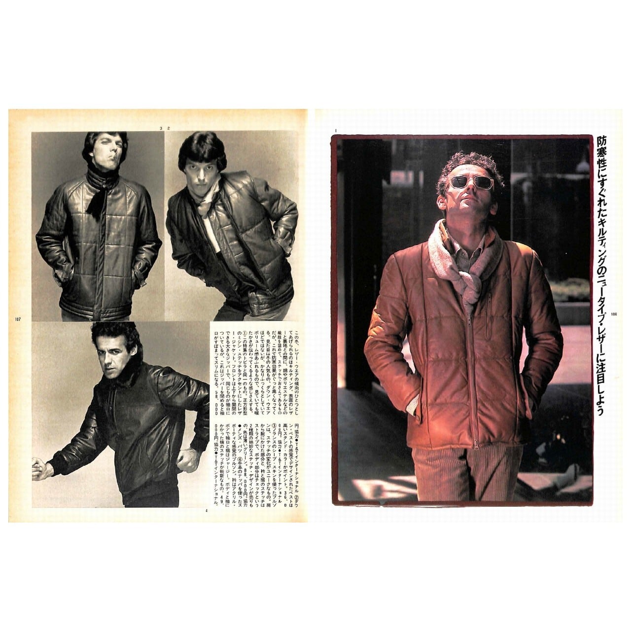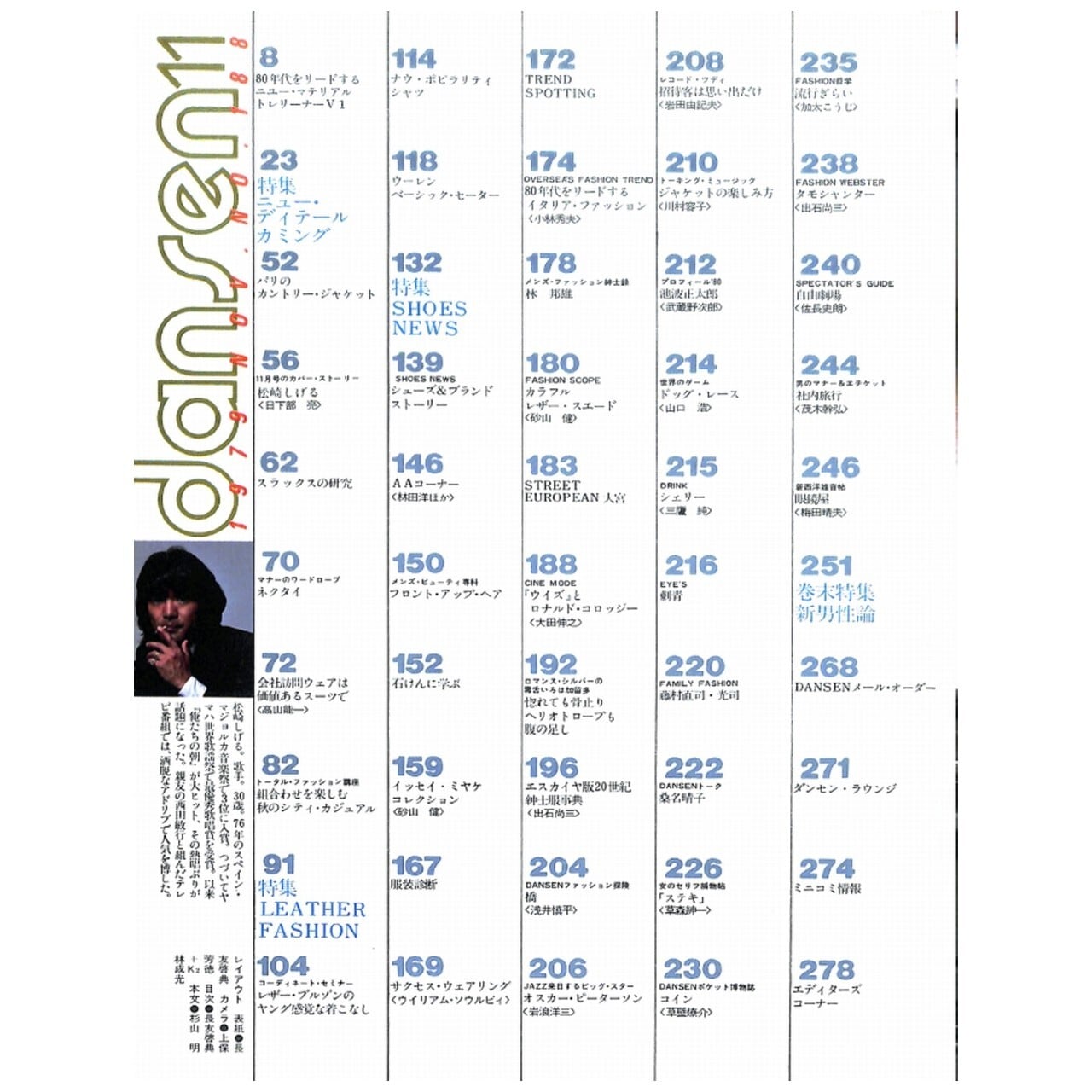 ◆80年代をリードするニュー・マテリアルトレリーナー V-1 / 特集 ニュー・ディテールカミング / パリのカントリー・ジャケット / 11月号のカバー・ストーリー 松崎しげる / スラックスの研究 / トータル・ファッション講座 組合わせを楽しむ秋のシティ・カジュアル / 特集 LEATHER FASHION / レザー・ブルゾンのヤング感覚の着こなし / 特集 SHOES NEWS / シューズ & ブランド ストーリー / 石けんに学ぶ / 80年代をリードするイタリア・ファッション / カラフル レザー・スエード / STREET EUROPEAN 大宮 / トーキング・ミュージック ジャケットの楽しみ方 / プロフィール'80 池波正太郎 / 世界のゲーム ドッグ・レース / DRINK シェリー / FAMILY FASHION 藤村直司・光司 / FASHION哲学 加太こうじ / SPECTATOR'S GUIDE 自由劇場 / 新西洋雑音帖 眼鏡屋 / 巻末特集 新男性論 / 他 ・・・目次より