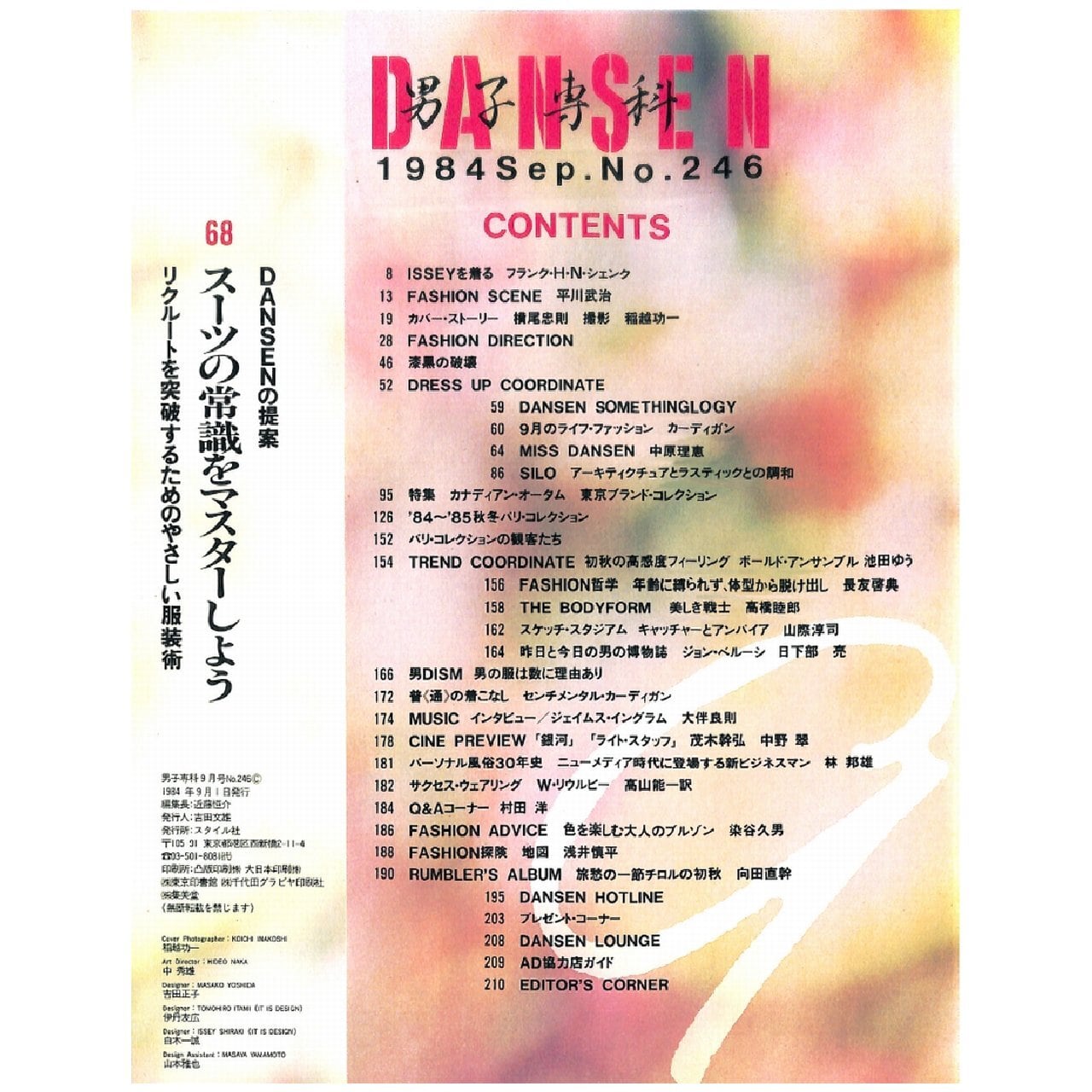◆カバー・ストーリー 橫尾忠則 / ISSEYを着る フランク・H・N・シェンク / FASHION SCENE 平川武治 / 漆黒の破壊 / 9月のライフ・ファッション カーディガン / MISS DANSEN 中原理恵 / SILO アーキティクチュアとラスティックとの調和 / 特集 カナディアン・オータム 東京ブランド・コレクション / '84〜'85 秋冬パリ・コレクション / パリ・コレクションの観客たち / TREND COORDINATE 初秋の高感度フィーリングボールド・アンサンブル / FASHION 哲学 年齢に縛られず、体型から脱け出し 長友啓典 / THE BODYFORM 美しき戦士 / スケッチ・スタジアム キャッチャーとアンパイア / 昨日と今日の男の博物誌 ジョン・ベルーシ / 男DISM男の服は数に理由あり / 普《通》の着こなし センチメンタル・カーディガン / CINE PREVIEW 「銀河」「ライト・スタッフ」/ パーソナル風俗30年史 ニューメディア時代に登場する新ビジネスマン / RUMBLER'S ALBUM 旅愁の一節チロルの初秋 / 他 ・・・目次より