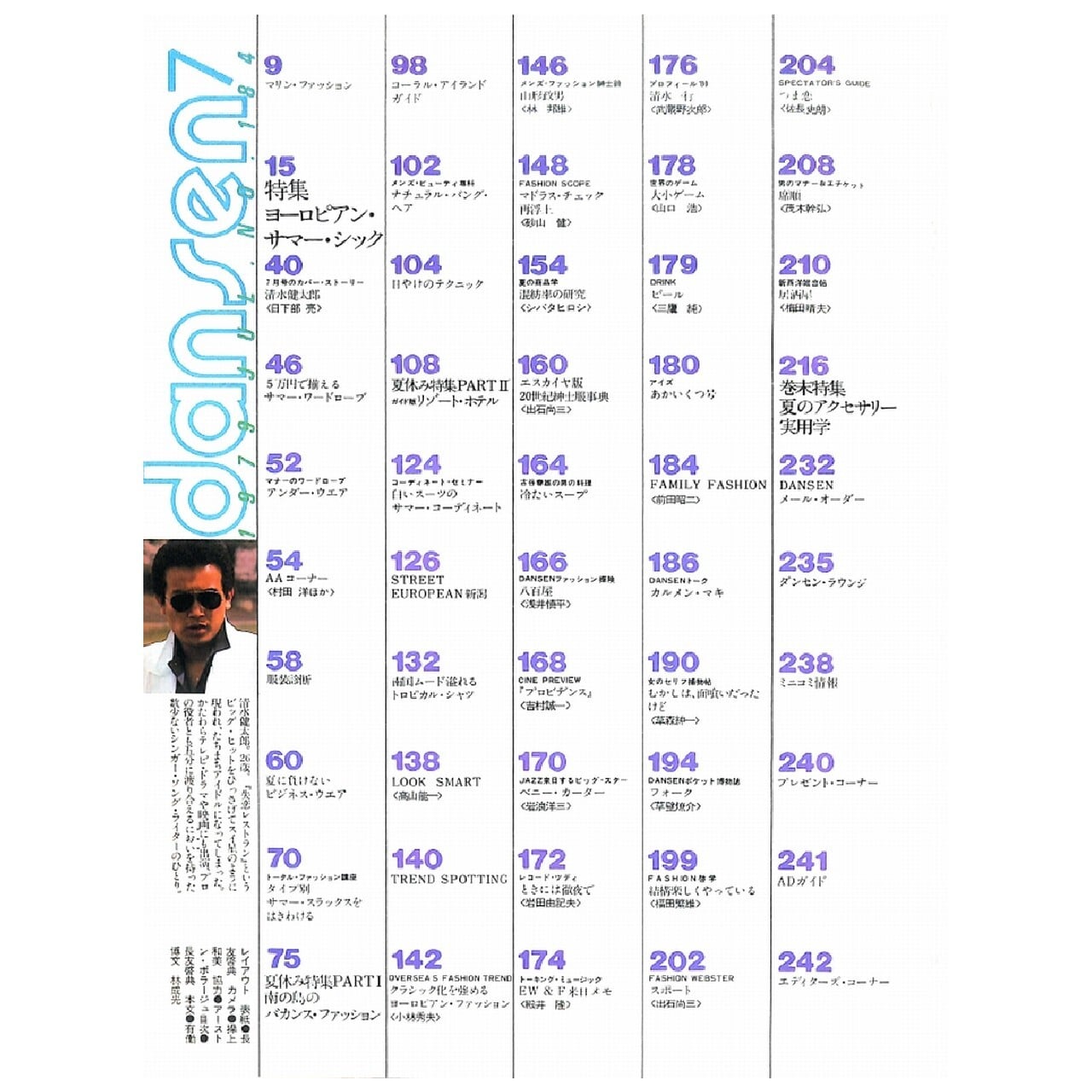 ◆カバー・ストーリー 清水健太郎 / マリン・ファッション / 特集 ヨーロピアン・サマー・シック / 夏に負けないビジネス・ウエア / サマー・スラックスをはきわける / 夏休み特集 PART I 南の島のバカンス・ファッション / コーラル・アイランド・ガイド / 日やけのテクニック / 夏休み特集 PART II ガイド版 リゾート・ホテル / 白いスーツのサマー・コーディネート / STREET EUROPEAN 新潟 / 南国のムード溢れるトロピカル・シャツ / エスカイヤー版 20世紀紳士服事典 / 古谷春雄の男の料理 冷たいスープ / DANSENファッション探険 八百屋 / CINE PREVIEW プロビデンス / JAZZ 来日するビック・スター ベニー・カーター / レコード・ツディ ときには徹夜で / 世界のゲーム 大小ゲーム / DRINK ビール / アイズ あかいくつ号 / DANSENトーク カルメン・マキ / FASHION哲学 結構楽しくやっている 福田繁雄 / 巻末特集 夏のアクセサリー実用学 / 他 ・・・目次より