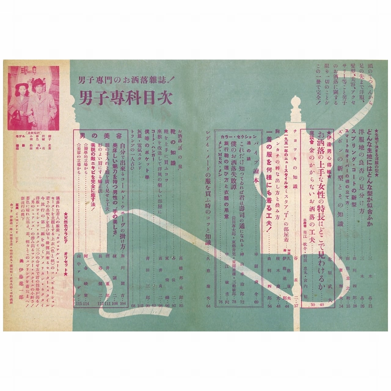 昭和25年(1950年)、『スタイル』の臨時増刊号として産声をあげた『男子專科』昭和11年(1936年)といえば、二・二六事件、日独防共協定の締結など、軍国主義へと向かう足音が高く高く響きわたりはじめていた時代、そんな時代に、おしゃれなファッション誌『スタイル』が宇野千代によって創刊された。