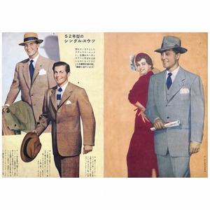 ◆表紙 伊藤進一郎・画 【解説】五二年の流行「ナチュラル・ルック」の服装である。上衣は衿の長い二つ釦で、生地はコーデュロイ。変りチョッキはタッタ・ソールの柄でこれも流行の一つ。また、シャツは衿を釦で止めるボタン・ダウン型で、ボウタイの巾も狭い新型である。このコーデュロイのハンチングを被った服装は、アメリカの大学生の間でも流行しているものである。