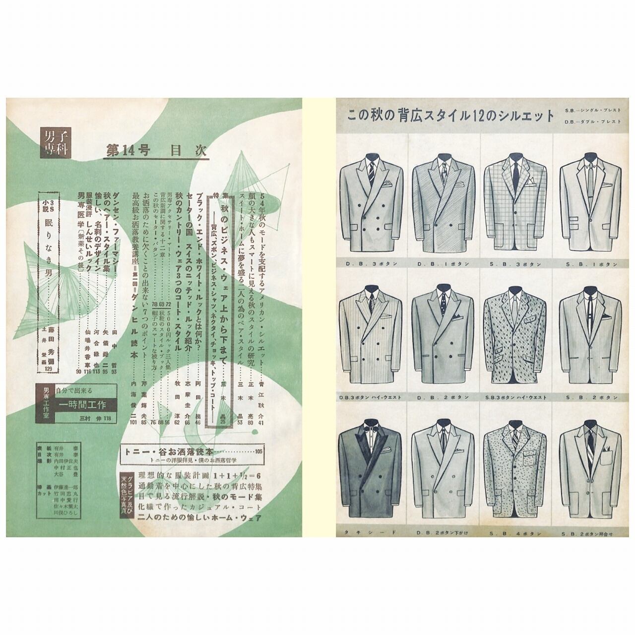 ◆秋のビジネス・ウエア特集 / 自分で出来る一時間工作 / トニー・谷お洒落読本 / 54年秋のモードを支配するアメリカン・シルエット / セーターの国スイスのニッテッド・ルック紹介 / 最高級お洒落教養講座(第1回「ダンヒル読本」) / 男専医学 / 目で見る流行解説・秋のモード集 /二人のための愉しいホーム・ウエア / 他 ・・・目次より