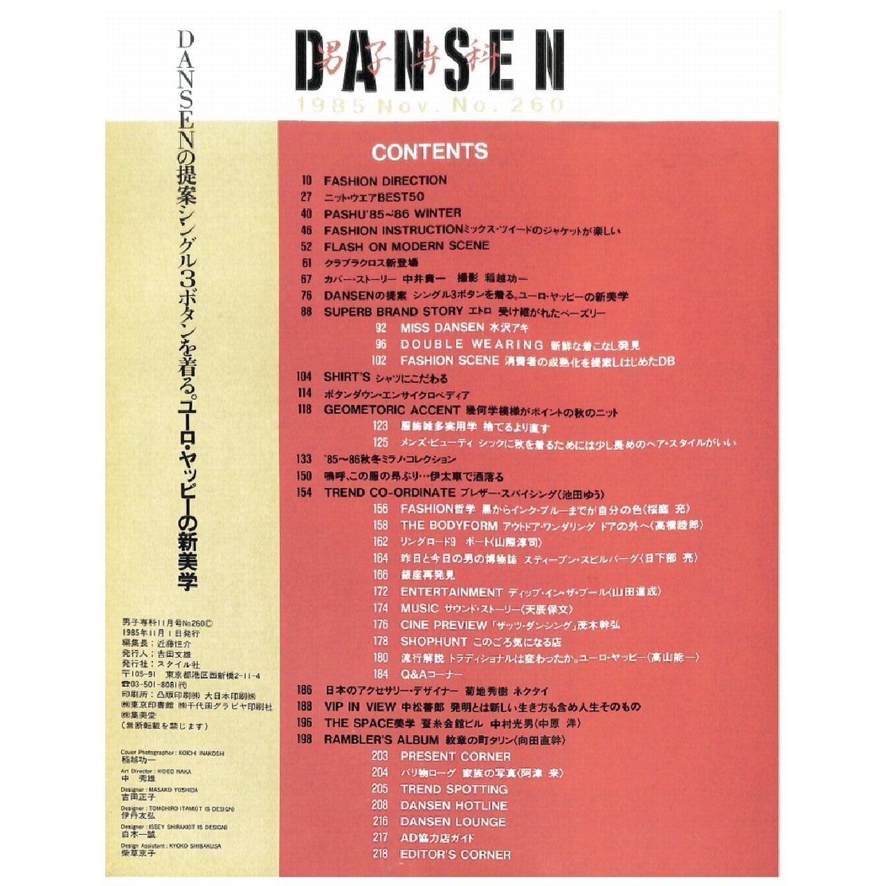 ◆DANSENの提案 シングル3ボタンを着る。ユーロ・ヤッピーの新美学 / ニット・ウエア BEST 50 / PASHU’85~'86 WINTER / FASHION INSTRUCTION ミックス・ツイードのジャケットが楽しい / クラブラクロス新登場 / カバー・ストーリー 中井貴一 撮影 稲越功一 / SUPERB BRAND STORY エトロ 受け継がれたペーズリー / DOUBLE WEARING 新鮮な着こなし発見 / SHIRT'S シャツにこだわる / 幾何学模様がポイントの秋ニット / メンズ・ビューティ シックに秋を着るためには少し長めのヘア・スタイルがいい / '85~'86 秋冬ミラノ・コレクション / FASHION 哲学 黒からインク・ブルーまでが自分の色 桜庭充 / 昨日の今日の男の博物誌 スティーブン・スピルバーグ / 銀座再発見 / MUSIC サウンド・ストーリー / CINE PREVIEW ザッツ・ダンシング / 流行解説 トラディショナルは変わったか。ユーロ・ヤッピー / THE SPACE 美学 蚕糸会館ビル 中村光男 / パリ物ローグ 家族の写真 / 他 ・・・目次より